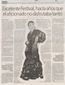 Crítica por Diego Díaz BerlangarTocó, en esa noche flamenca, la hora del Baile. Con una sonora ovación fue recibida ¨La Yunko¨, nombre artístico de Junko Hagiwara, nacida en Kawasaki Japón. Se inició en el aprendizaje del baile en Tokio con AMI. En el año 2002, se trasladó a Sevilla, donde amplió sus estudios con diversos maestros como José Galván , El Torombo, Milagros Mengíbar y Carmen Ledesma. Comenzó a bailar en público, en el Teatro Central de Sevilla,bajo Belén Maya y Rafaela Carrasco, Lope de Vega,bajo Esperanza Fernández y Miguel Vargas, Expo Zaragoza y Teatro Madrid con la compañía de Yoko Komatsubara. Compatibilizando dichas actuaciones, con la asistencia a numerosos cursos y cursillos de formación impartidos por lo más granado del baile. Entre ellos los de Sara Baras, Matilde Coral y Eva ¨La Yerbabuena¨.Multitud de primeros premios jalonan la trayectoria artística de ¨La Yunko¨. Con la guitarra de Miguel Pérez y el cante de Miguel Picuo y Moi de Morón, la bailaora empezó bailando por soleá, donde la técnica,el dominio de las reglas y en definitiva el oficio, que sin duda artesora,se hacían por momentos invisibles ante la belleza plástica y armónica, que por momentos nos ofrecía. Bailaora sobraba de pies, pero que no olvida ese baile de cintura para arriba,tan femenino y cautivador, ese braceo, juego de manos y altivez de cabeza; quedándome para el recuerdo, esa expresión facial, evocadora del sentir de todo pueblo.Con bata de cola roja, acometió su segundo baile, que fue por alegrías de Cádiz. Bailaora pequeña en estatura, que se creció conforme ejecutaba el estilo. Para mí, ¨La Yunko¨baila con el corazón y con la cabeza, pero sobre todo baila muy en mujer, muy femenina.