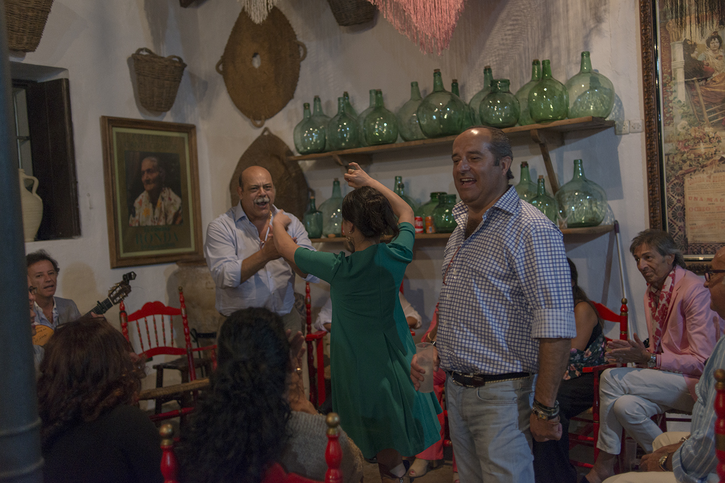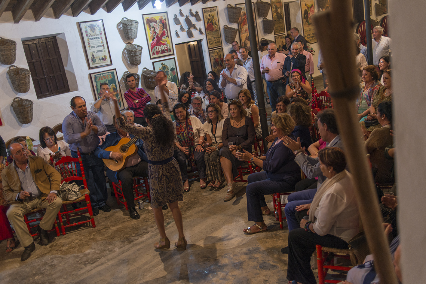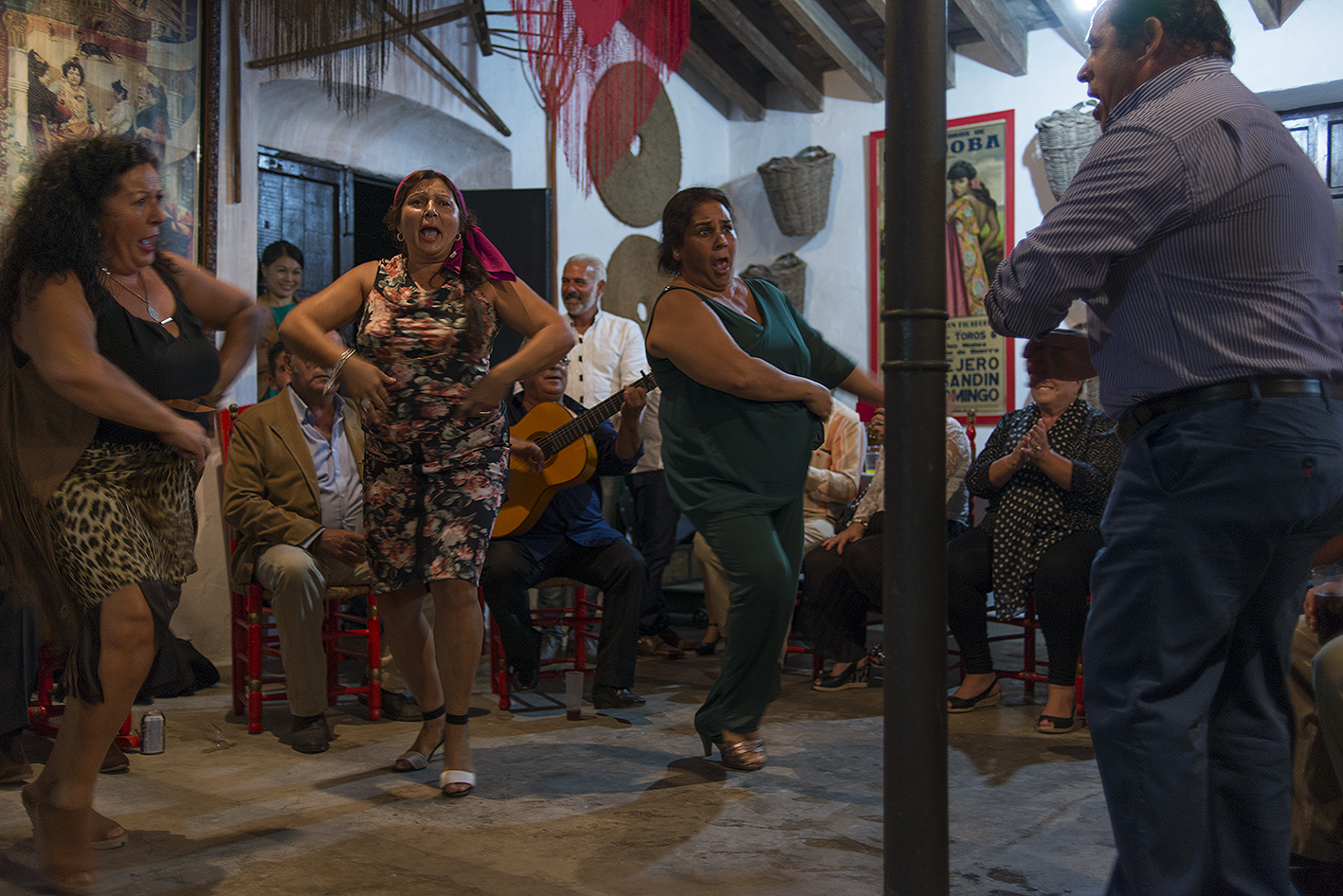 あーこんなんじゃ、イネスが可哀想過ぎる。と思ってぱっと斜め前を見たら、レブリーハのブレリアのコンパスでパルマをたたいていた人がいた。そう!そう!あなた!!!救世主のパルマとイネスの歌に耳ダンボ。でも多勢に無勢で、それらはヘレスのブレリアのパルマに消されて行く・・・あああああああああ・・・すると、どうしたことか、誰か出て来ちゃったよ・・・・、アンタ、イネスの歌で踊る気か?ダメってことはない。でもその出方で大体、その人がどのくらい踊れるのかが分かる。どれくらい踊れるかってのは、舞踊技術がどれくらいあるかということではなく、カンテをどうやって聴いて、カンテをどうやって踊るのかということ。その人は明らかに、とにかく何でもいいから踊りたくて仕方ない人。フィエスタの輪の中心に立って踊りたがるだけの人・・・あああああああ・・・そんな人にイネスの歌が汚されてゆく・・・・って言うのは言い過ぎかもしれないけど、フィエスタだからそんなこと考え過ぎなのかもしれないけど、そう思ってしまった・・・当然、イネスの歌とは全然関係ない踊りをして、イネスの歌は終わってしまう。可哀想なイネス・・・・誘われた分際でこんなこと思っちゃ悪いのだけど、このフィエスタは一体なんなんだ・・・しばらく微妙なブレリアが続き、気付いたらアナ・マリア・ロペスとイネスは完全に姿を消していた・・・そしてまたあのギタリストがルンバとセビジャーナスに戻してしまう・・・・