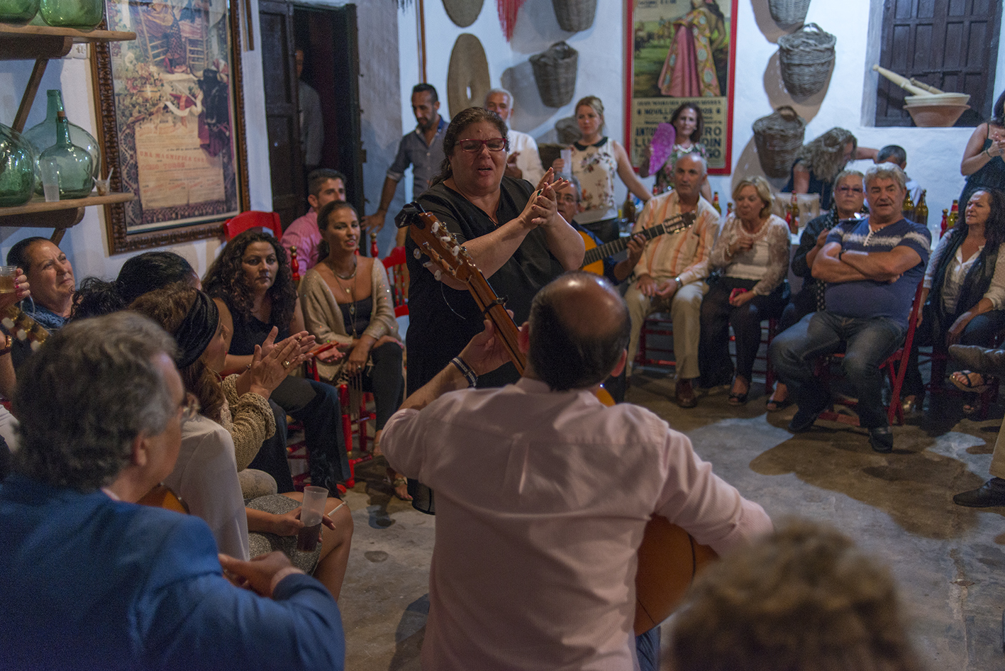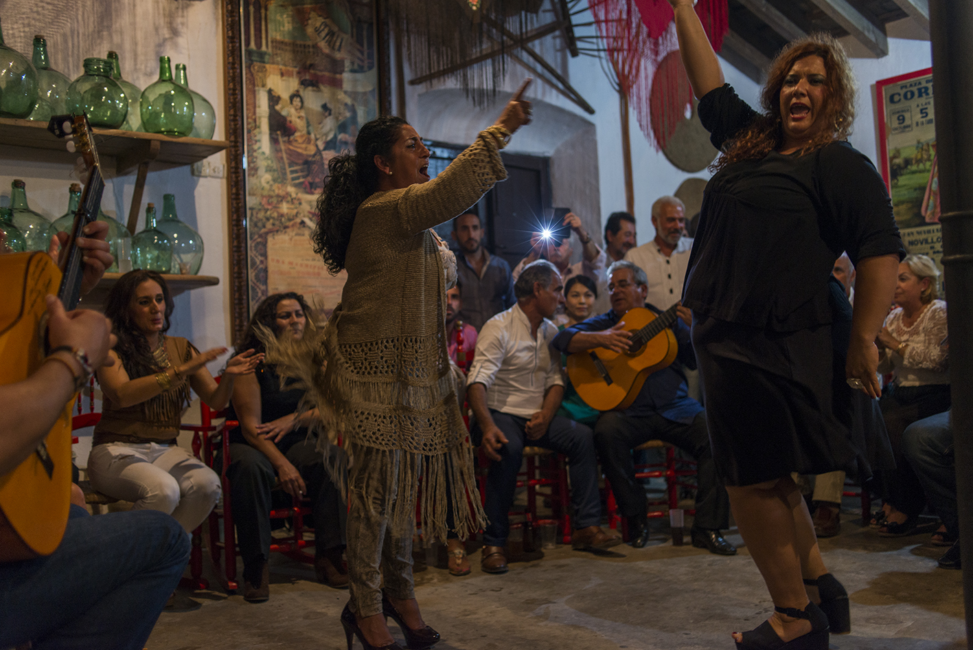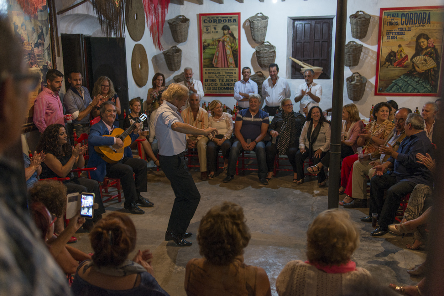 あーこんなんじゃ、イネスが可哀想過ぎる。と思ってぱっと斜め前を見たら、レブリーハのブレリアのコンパスでパルマをたたいていた人がいた。そう!そう!あなた!!!救世主のパルマとイネスの歌に耳ダンボ。でも多勢に無勢で、それらはヘレスのブレリアのパルマに消されて行く・・・あああああああああ・・・すると、どうしたことか、誰か出て来ちゃったよ・・・・、アンタ、イネスの歌で踊る気か?ダメってことはない。でもその出方で大体、その人がどのくらい踊れるのかが分かる。どれくらい踊れるかってのは、舞踊技術がどれくらいあるかということではなく、カンテをどうやって聴いて、カンテをどうやって踊るのかということ。その人は明らかに、とにかく何でもいいから踊りたくて仕方ない人。フィエスタの輪の中心に立って踊りたがるだけの人・・・あああああああ・・・そんな人にイネスの歌が汚されてゆく・・・・って言うのは言い過ぎかもしれないけど、フィエスタだからそんなこと考え過ぎなのかもしれないけど、そう思ってしまった・・・当然、イネスの歌とは全然関係ない踊りをして、イネスの歌は終わってしまう。可哀想なイネス・・・・誘われた分際でこんなこと思っちゃ悪いのだけど、このフィエスタは一体なんなんだ・・・しばらく微妙なブレリアが続き、気付いたらアナ・マリア・ロペスとイネスは完全に姿を消していた・・・そしてまたあのギタリストがルンバとセビジャーナスに戻してしまう・・・・
