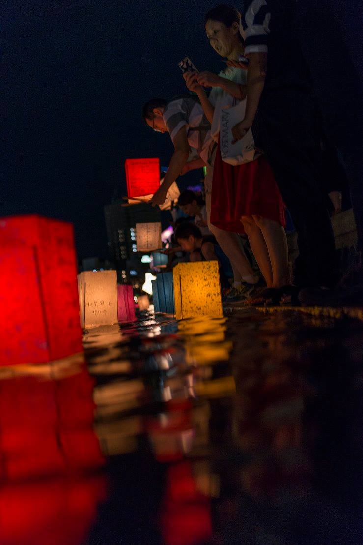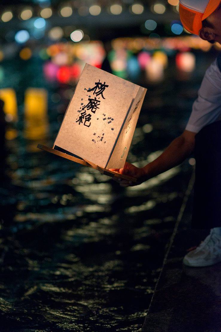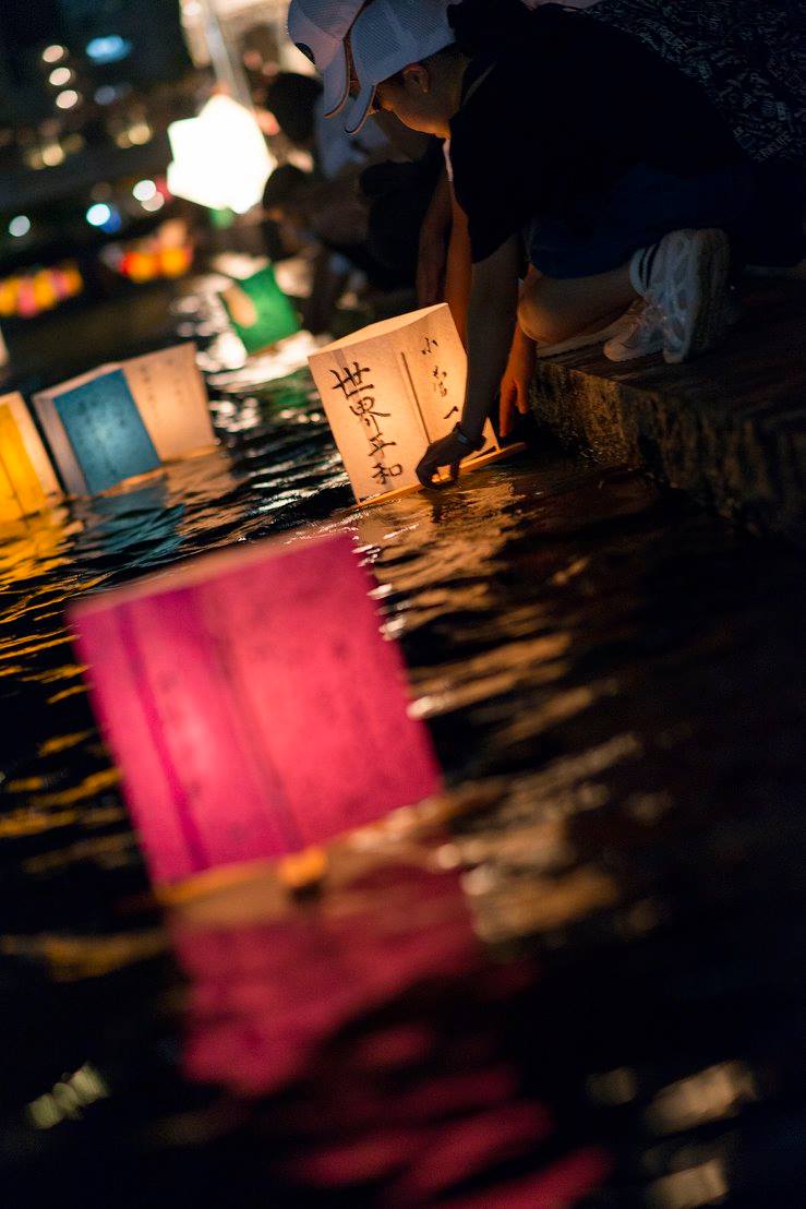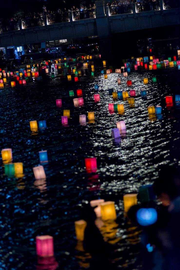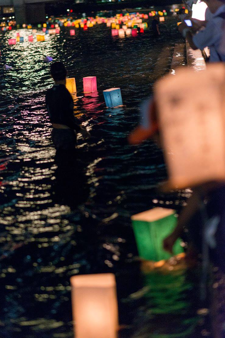 流れてゆくたくさんの灯篭をずっと見ていました。灯篭がちゃんと流れるように、川の中に腰まで浸かって灯篭を送り出している人たちがいました。
