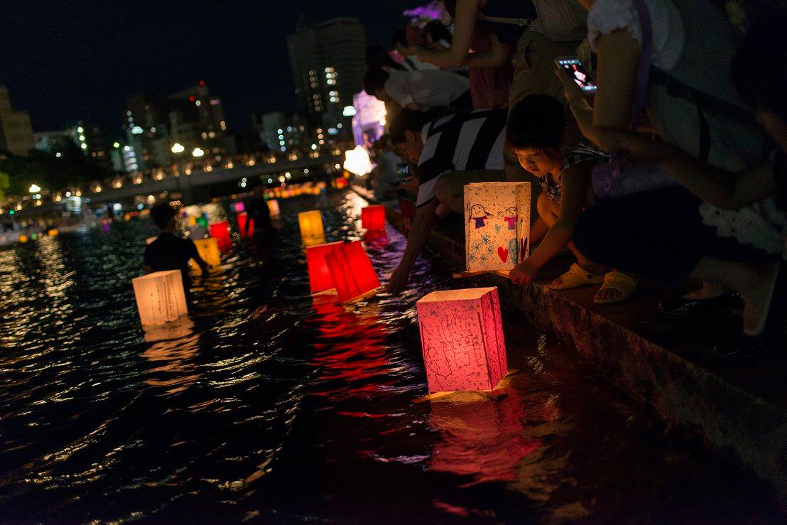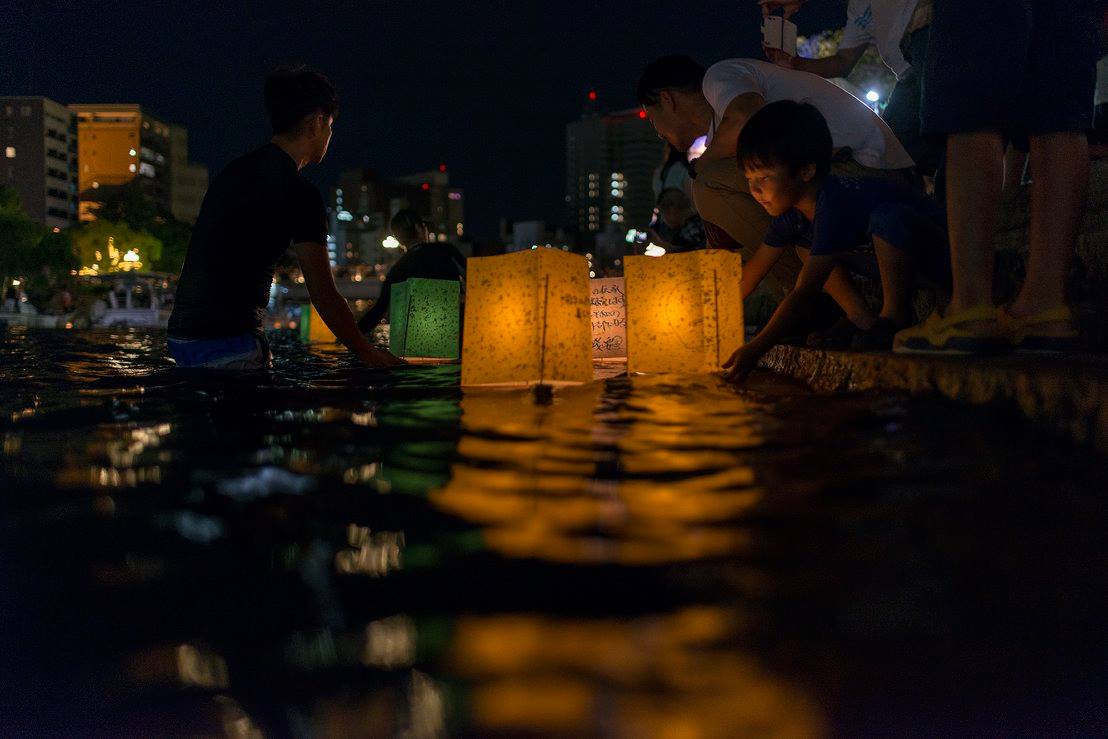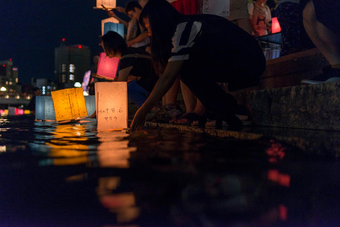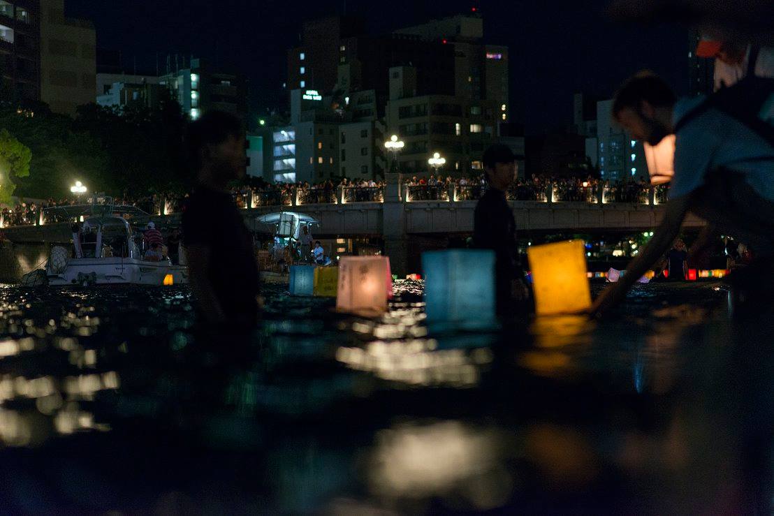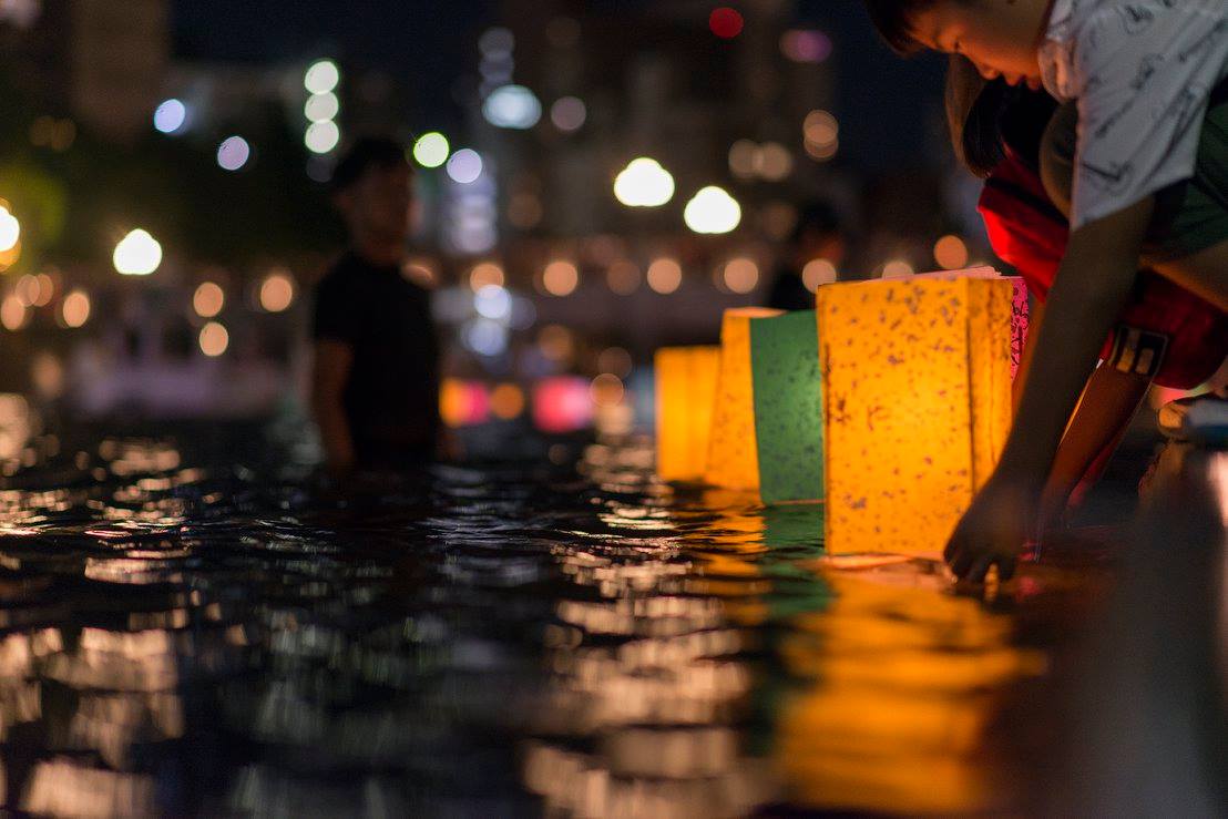 流れてゆくたくさんの灯篭をずっと見ていました。灯篭がちゃんと流れるように、川の中に腰まで浸かって灯篭を送り出している人たちがいました。