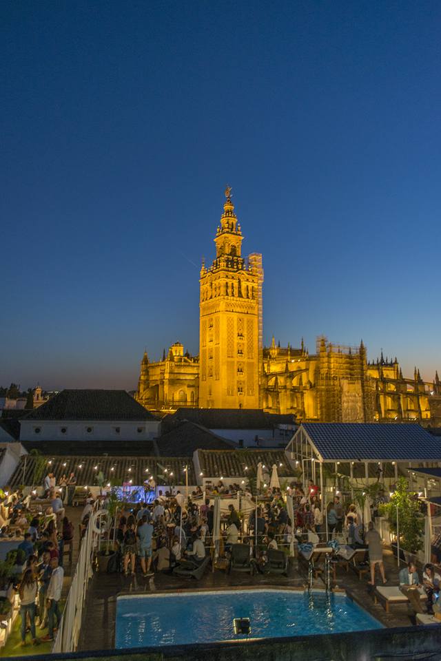 ブログアップが遅れましたが、日曜に「Pura Vida Terraza」(プーラ・ビーダ・テラサ)に行ってきました。ここ、セビージャ観光一押しスポットです!カテドラルの近く「Hotel Los Seises」(Hotel Los Seises HPはこちら)の屋上にあるテラスなのですが、セビージャのシンボル、ヒラルダの塔がドーンと間近に見えるんです。ヒラルダの塔って、普通遠くから見たり、真下から見上げるもの・・・それが本当に近くに、手が届きそうな位置で見られるなんて!!!ホテル宿泊客でなくても普通に入れますから、セビージャにいらっしゃる方は是非!是非!
