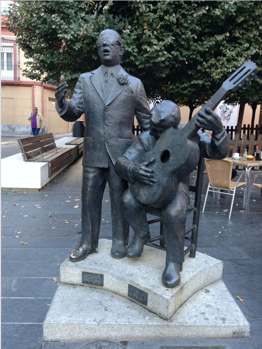ヒターノの名字もアンダルシアではあまり聞かない、Saavedra, Salazar, Suarezなど。逆にアンダルシアのヒターノに多い名字、例えばCarrasco,Montoya,Vargasなどはエクストレマドゥーラ地方ではほとんど聞かれないとのことです。フラメンコのアーティストで有名なのは、上記の動画には録画されていませんが、まず歌い手のPorrina de Badajoz(ポリーナ・デ・バダホス。1924−1977)。彼の銅像(写真)が現在、バダホスの街の中心にあります。