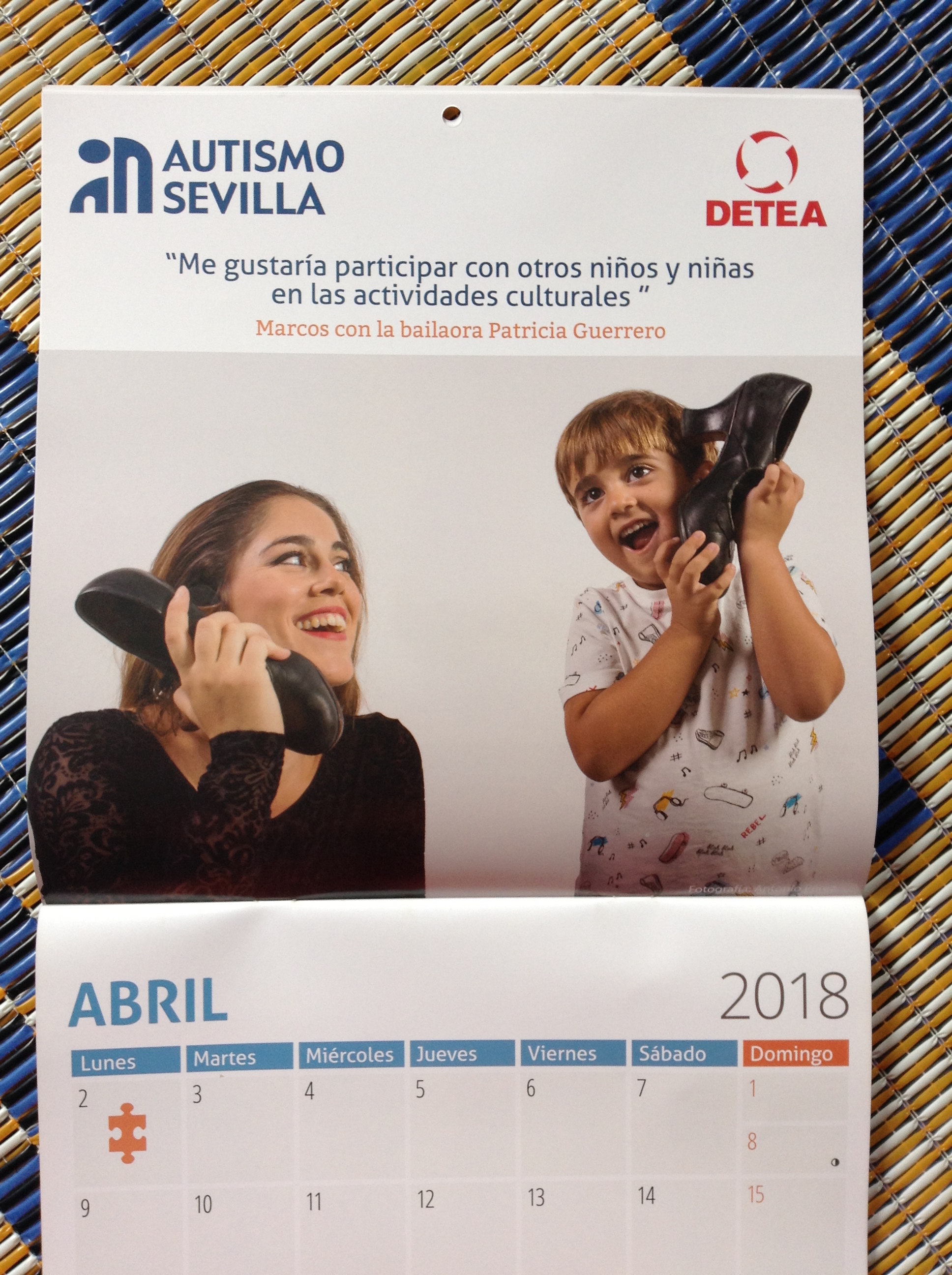 自閉症の子供たちとフラメンコアーティストがコラボレーションした来年のカレンダーの3月と4月に、夫アントニオ・ペレスの写真が掲載されています。3月にホセ・バレンシアとカルメンちゃん、4月がパトリシア・ゲレーロとマルコくん。子供たちとアーティストの笑顔、視線がとっても印象的です。その他に掲載されているアーティストは、ドランテス、ミゲル・ポベダ、アルカンヘル、エスペランサ・フェルナンデス、レオノール・レアル・・・・etc。たくさんのアーティストの協力があったとのことです。