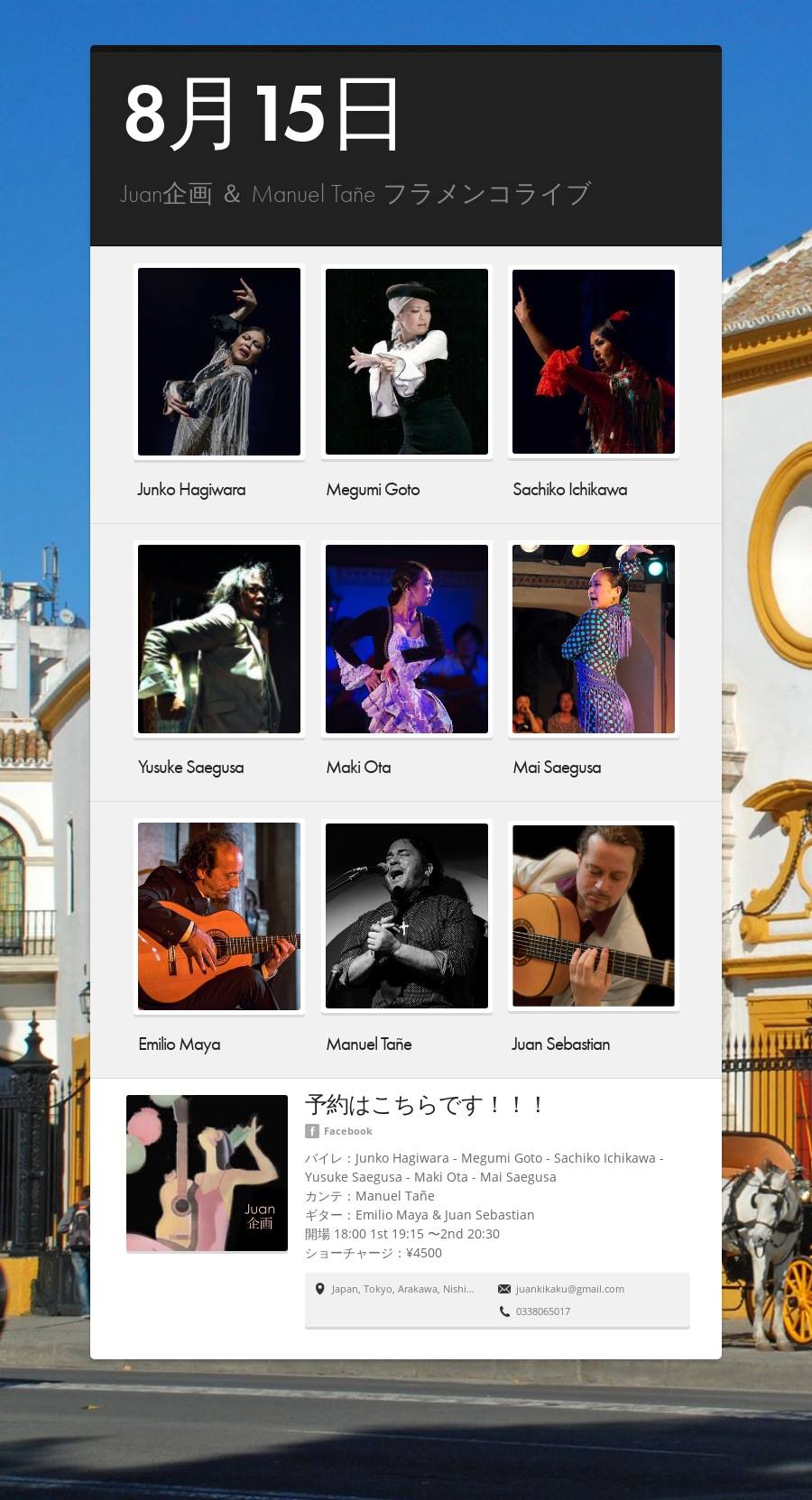 明日8/15(水)西日暮里のタブラオ「アルハムブラ」さんにてライブ出演致します。数日前の情報では「ほぼ満席」とのことでした。すでにご予約下さいました皆様、ありがとうございます!今後のご予約、空き状況に関してはアルハムブラさん(TEL 03-3806-5017)の方へ直接お問い合わせ下さるようお願い申し上げます。