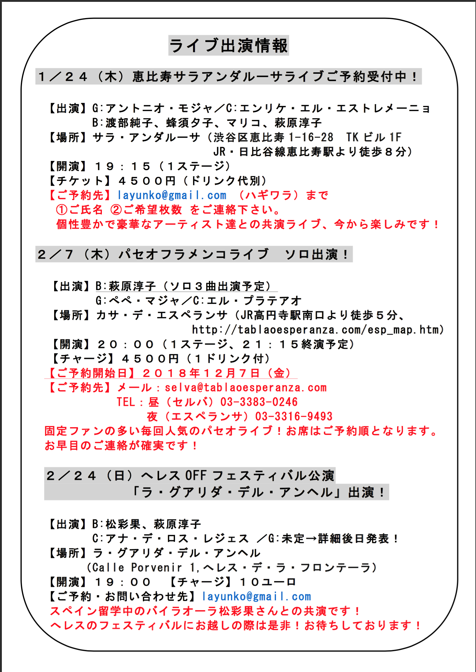 なお、先日ご案内させて頂きました、1/24(木)恵比寿アンダルーサライブと2/4(木)パセオフラメンコライブのお申し込み日・お申し込み先は以下となっております。