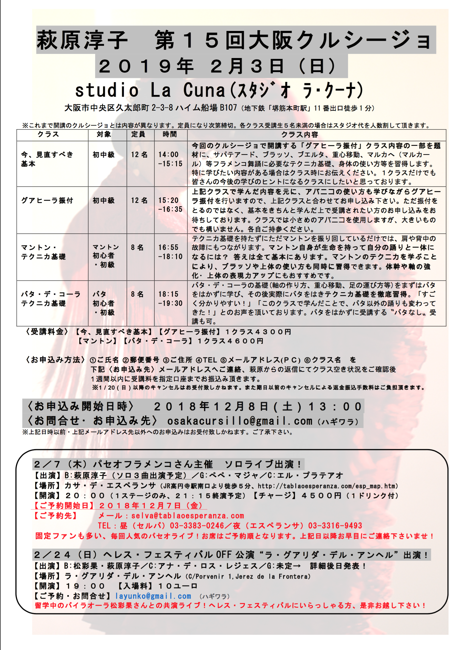 「第24回少人数制クルシージョ」(東京1/26〜2/17)、「第15回福岡クルシージョ」(小倉グラシアフラメンカ、2/1・2)詳細は来週以降発表予定です。開講クラスに関してはこちら→「クルシージョ」にて発表してありますので、よろしければご覧ください。ではお待たせして申し訳ございませんが宜しくお願い致します!