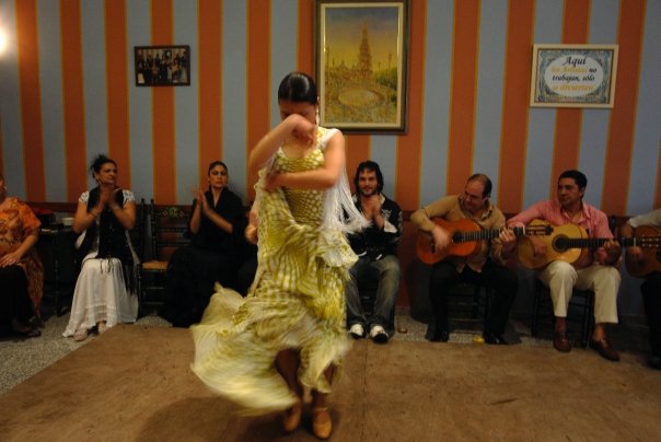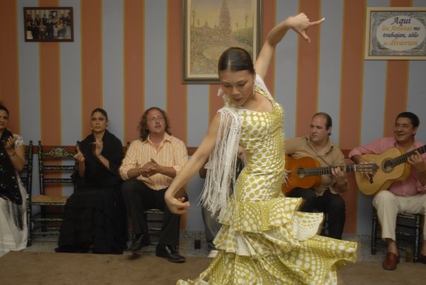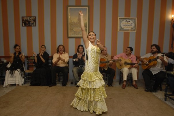その日学校は早退。家に飛んで帰って衣装や化粧品や準備して会場となるセビージャ郊外のレストランに向かいました。今でこそアントニオ・モジャもマヌエル・タニェもルビオ・デ・プルーナも日本で働いています。つまり自分が申し込めさえすれば、実力の有無にかかわらず彼らと共演できてしまう。なんとまあ、お手軽に。でもあの当時は違いました。(というか、今でもスペインでは違う。日本は環境が甘い。)ただの日本人フラメンコ留学生が、人前で踊ったことなんてほとんどなく、しかも事前の合わせなしの即興で、そんなアーティスト達と共演なんて・・・・。いまだに覚えています。その場にいた別の共演アーティストに挨拶するとふーんといった顔で私を一瞥しただけで、挨拶すらしてくれなかった。彼からすると、なんでお前がここに呼ばれてるんだ、ということなのでしょうが。
